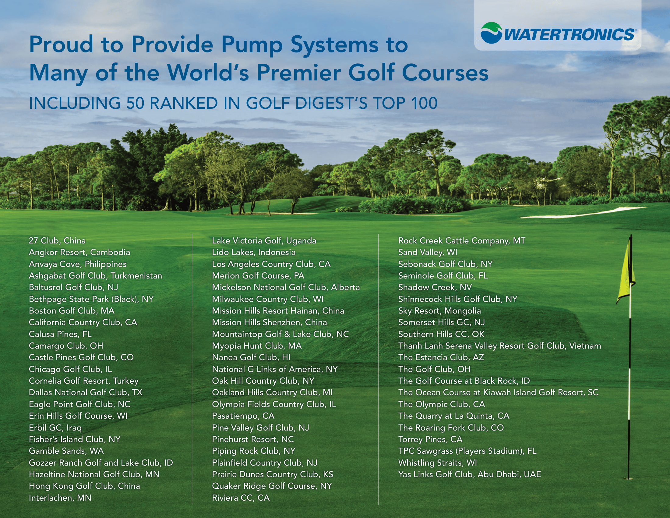 Since 1986, Watertronics has led the industry with cutting-edge technology that provides superior golf irrigation results. Working closely with golf course owners, superintendents and designers, Watertronics pumping systems deliver the ultimate in efficiency, reliability and provide the lowest life cycle cost in the industry. Proprietary features such as mechanical seals, EBVs, WaterVision cloud-based monitoring, revolutionary high spec vertical turbine pumps, and our thorough dynamic certified factory testing before shipment are among the list of what sets Watertronics apart from the competition.