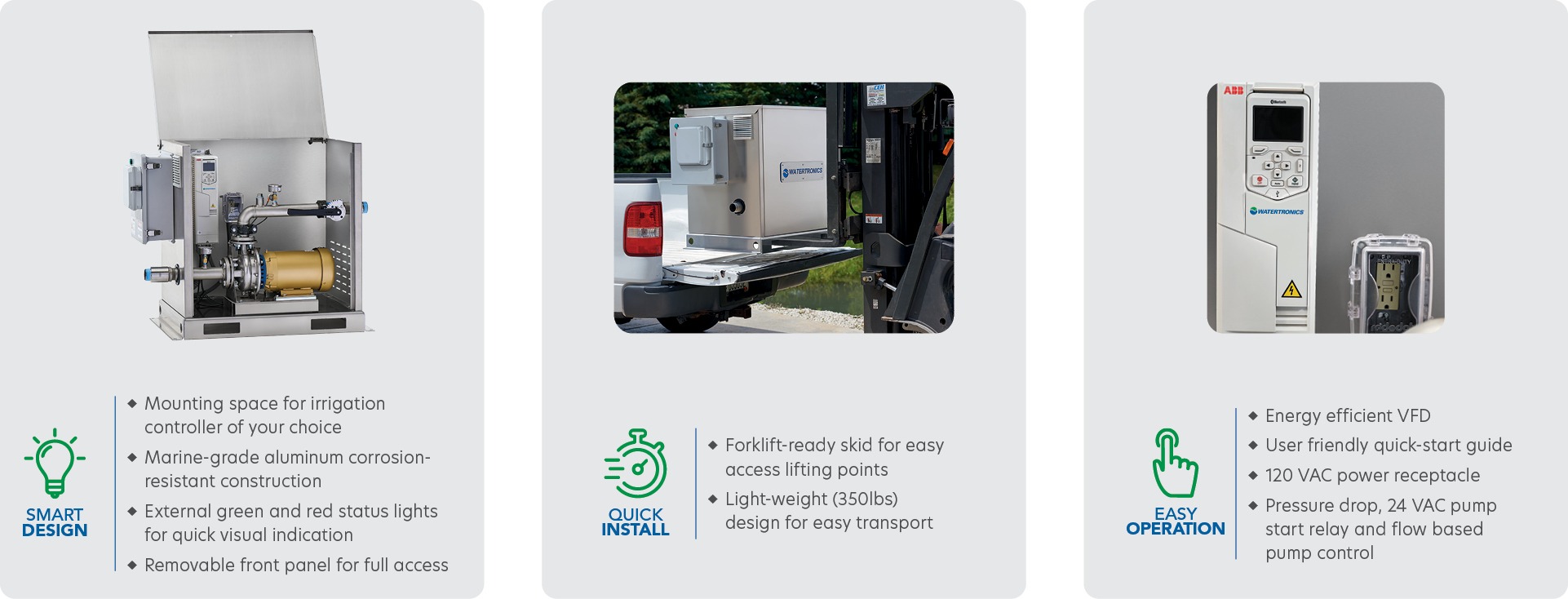 • Energy efficient Variable Frequency Drive (VFD) maintains constant pressure at varying flow demand